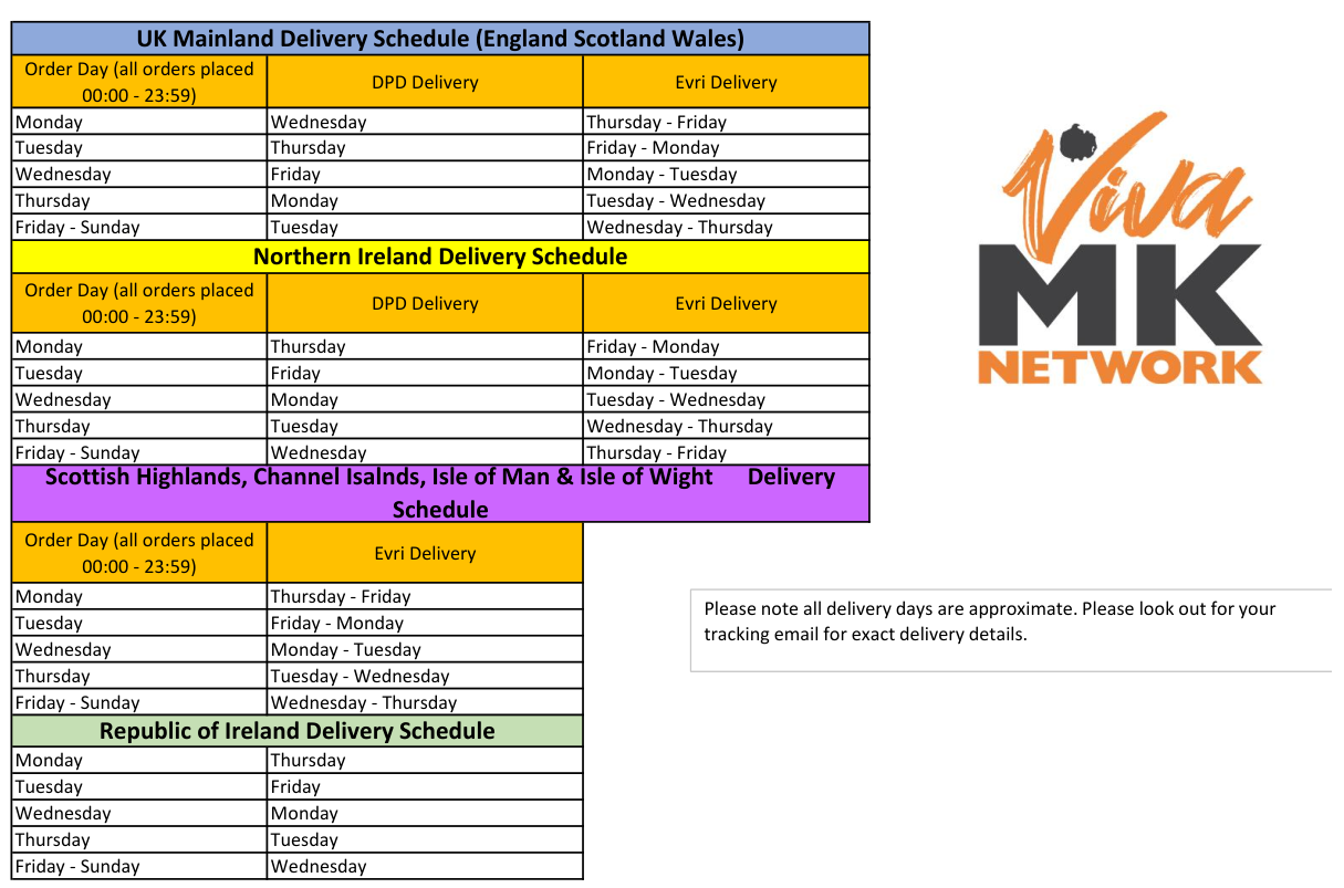 All Orders are £6.95 and delivered 2-3 working days from despatch by Evri.